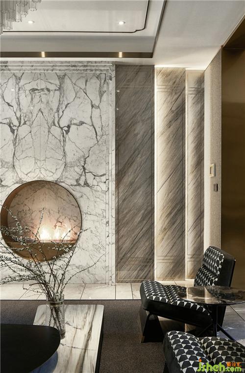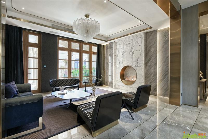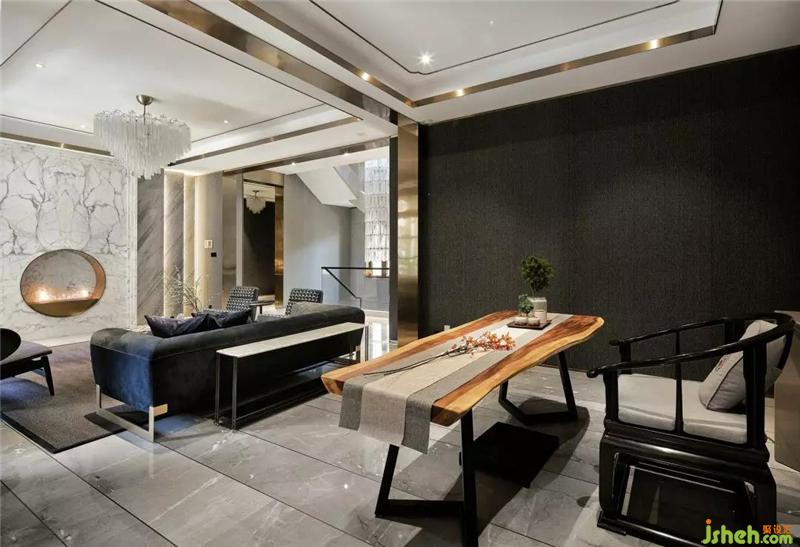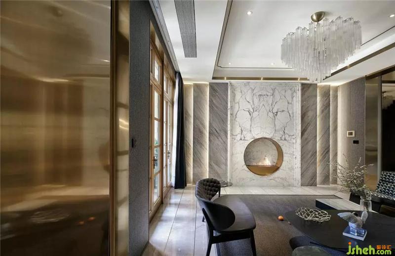 在這個遠離塵囂的法式合院里,更是于繁華都市中獨享一片寧靜,推開家門,撲面而來的繁花背景搭配金屬材質(zhì)的端景臺,豐富的材質(zhì)與色彩變化,增添雅奢趣味,方正開闊的空間,避免繁雜線條與多余家具,當居住者身處其中,亦能感受到空間開揚洗煉、明亮采光縈繞。