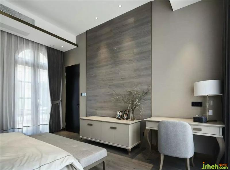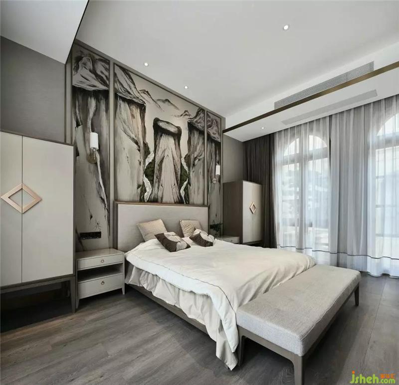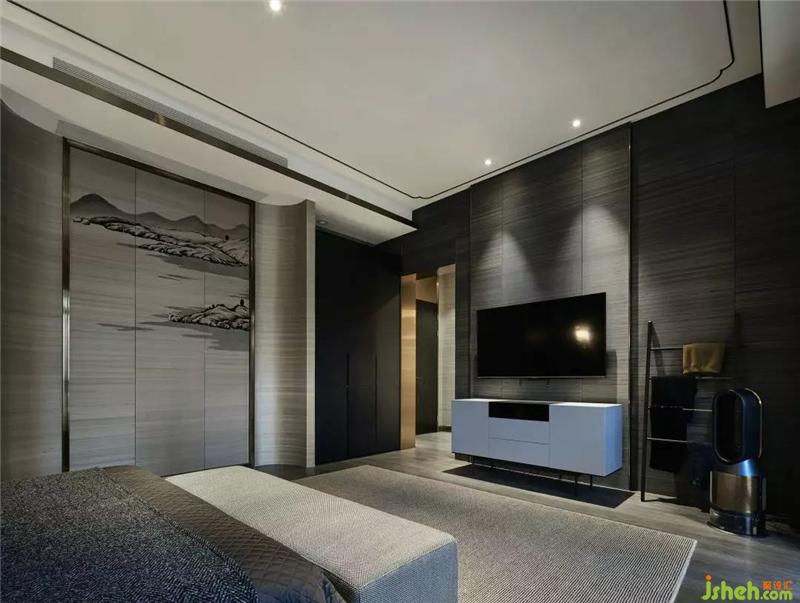 老人房以“高山流水”為主題,暖灰調(diào)的色彩舒適靜謐,墻面不銹鋼造型的延續(xù),在傳統(tǒng)的中式意境中注入現(xiàn)代時尚元素,整個色調(diào)沉穩(wěn)雅趣,別墅裝飾符合老年人的審美情趣。