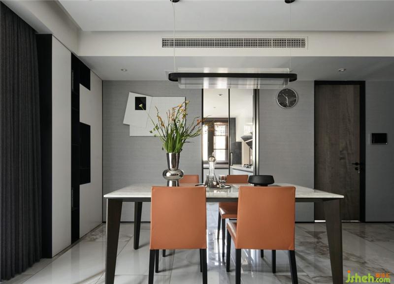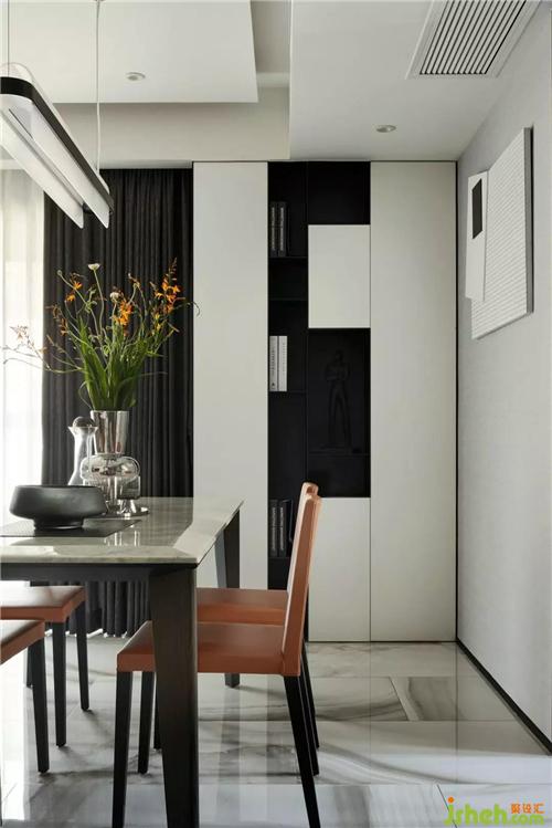 餐廳鋼琴配色的裝飾柜,在入戶一進門就視覺聚焦,提升空間的藝術氣息。