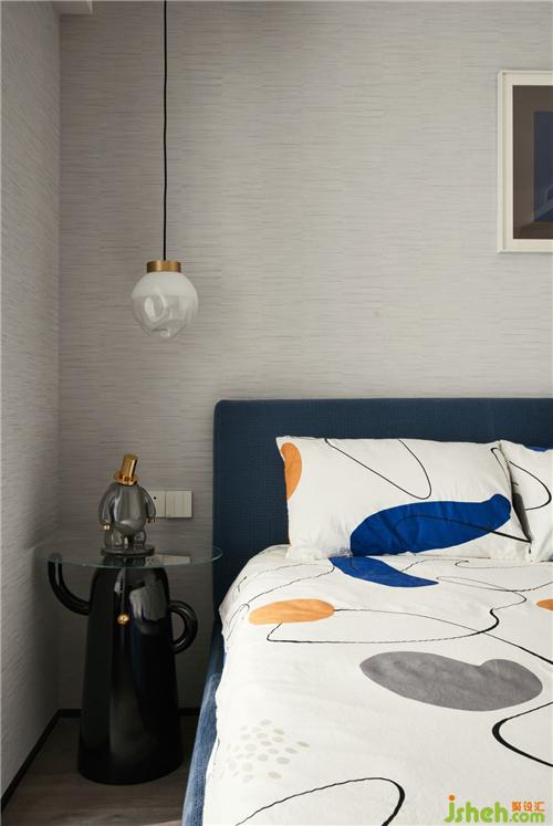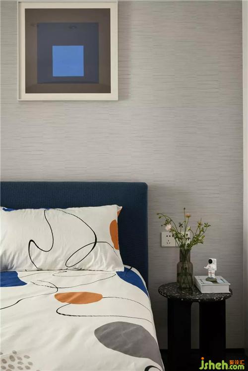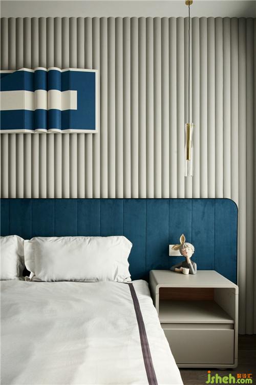 杭州裝修設(shè)計(jì)波浪紋的床頭背景搭配海藍(lán)色床頭靠背,夜晚降臨,如同沉睡在海洋之上,安撫人心,自由自在。