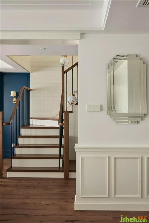 杭州裝修設(shè)計原木樓梯讓人感受自然寧靜的氣息,同色扶手及黑色的鐵藝搭配,視覺和觸覺伴隨著空間的展開,自然傳遞。