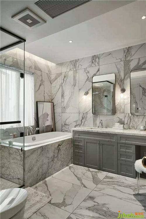 花白大理石和灰色洗手柜的簡單配色讓杭州裝修設計衛(wèi)生間顯得干凈清爽,雅致趣味。