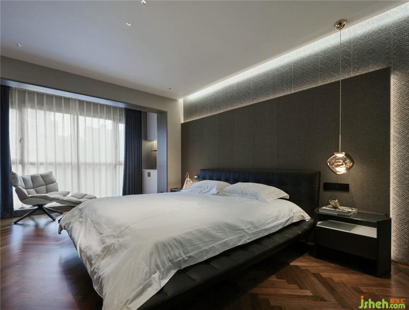 次臥室質(zhì)感強(qiáng)烈的壁紙?jiān)黾恿苏麄€(gè)空間舒適度,個(gè)性的燈具,冷淡中又不失趣味。