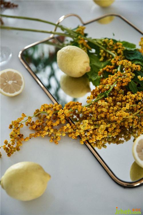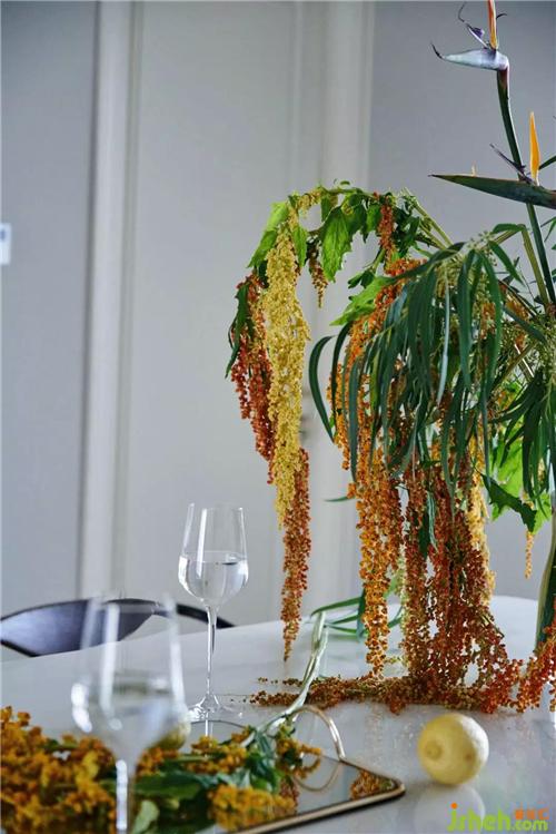 餐廳在保留原功能柜的同時,依然延續(xù)客廳的設(shè)計,從色彩到配飾整體調(diào)整氛圍,白色圓球球項鏈燈個性而獨特,搭配餐桌上春華秋實的花藝,一派豐收的景象。