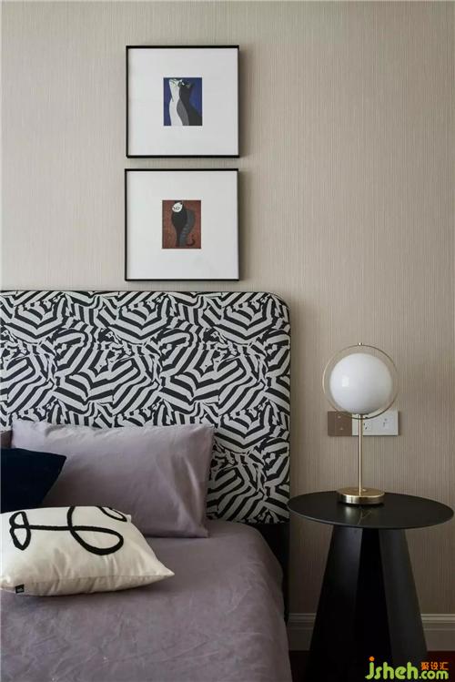 次臥室黑色紋路的床背,充滿個性時尚感,裝飾畫的重疊豎排和動物變形的圖案,無形增加了空間的趣味性,金屬球形燈更是在空間起到點睛的作用。