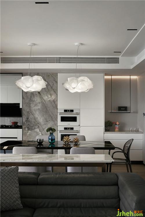 客廳餐廳連接式的布局是提高空間利用率的好方法,黑色巖板餐桌在灰色大理石墻面的映襯下,顯得華麗又質(zhì)感,白色調(diào)的西廚劃分合理,繁多的雜物都可以收納妥當(dāng)杭州裝修公司。