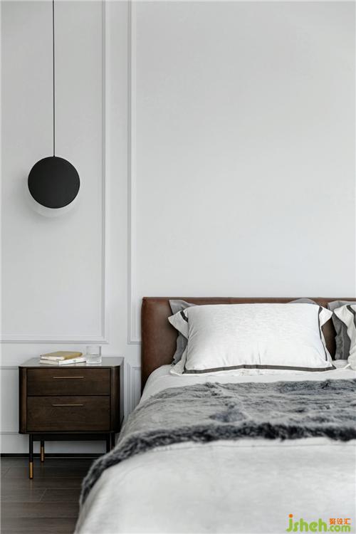 臥室以白色為基調(diào),黑白的床品、卷紋的壁畫,都營(yíng)造了一個(gè)放松休閑、寧靜舒適的休憩空間,而落地玻璃窗將視覺延伸出去,隨即可觀賞窗外美景。