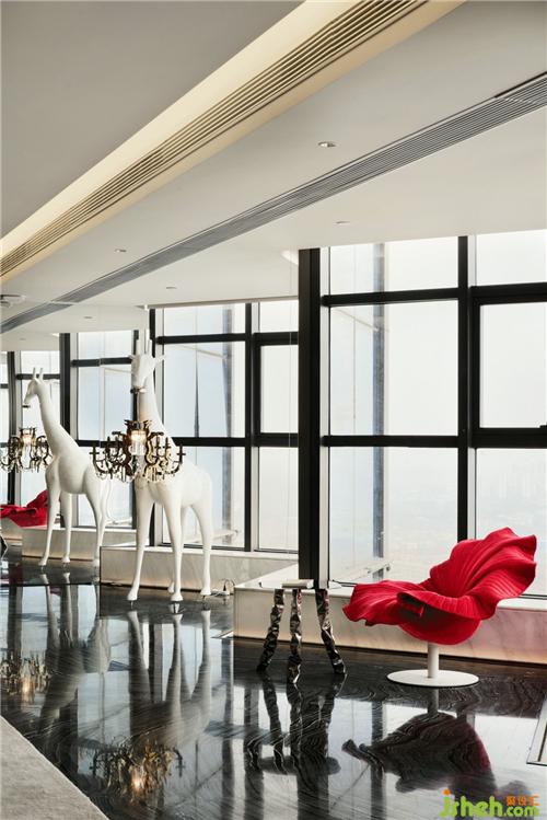 個性長頸鹿裝飾燈具端莊地立于空間一角,加注了空間的趣味感,綻放的紅色扶手椅與白墻相映成趣,氛圍呈現(xiàn)出極具品味華而不俗的空間氣質(zhì)店鋪裝修設(shè)計。