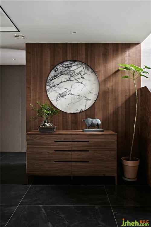 入戶直面的端景臺(tái)充當(dāng)著連接客餐廳的角色,胡桃木的自然紋路婉婉訴說(shuō)著空間里的質(zhì)樸生活。杭州室內(nèi)設(shè)計(jì)師餐桌和水吧臺(tái)的結(jié)合,極大增加了餐廳的實(shí)用性。
