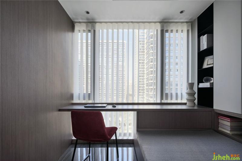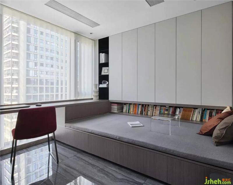 多功能的書(shū)房延續(xù)了客餐廳深色的理石地面和原木灰木飾面,紹興裝修設(shè)計(jì)和書(shū)桌連接處獨(dú)立出一個(gè)黑色開(kāi)放柜構(gòu)建了空間幾何感,酒紅色的單椅和中灰的布藝坐塌,使得整個(gè)空間顯得非常有層次和舒適。