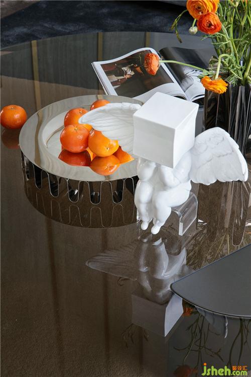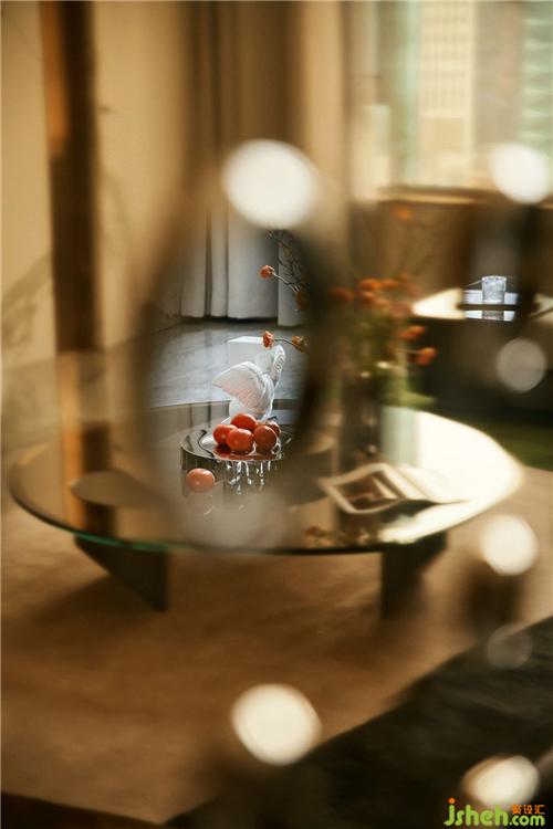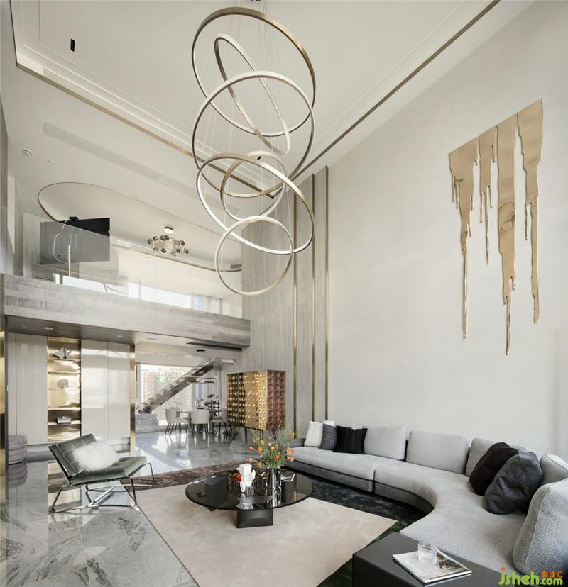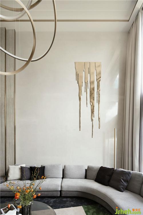 客廳背景的金色藝術(shù)裝飾宛如大自然水滴聚集落下那一瞬間形成的美妙天然狀態(tài),與這套位于錢塘江畔數(shù)百米外的一線江邊景色相互呼應.