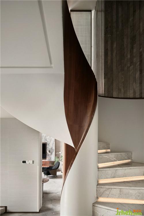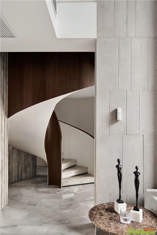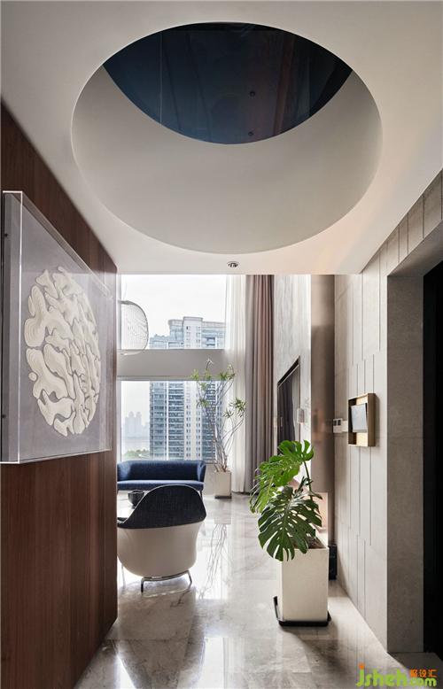 最使人驚艷的是玄關(guān)設(shè)計(jì)。推門(mén)進(jìn)來(lái),映入眼簾的是一面用木飾面打造的精致隔斷,頂上天井設(shè)計(jì),鏤空到二樓家庭廳位置,杭州豪宅設(shè)計(jì)完美解決了玄關(guān)光線較暗的問(wèn)題。破口沖天,似有想突破拼出一翻天地,天井,不止是一方美景,更是一方哲學(xué)。