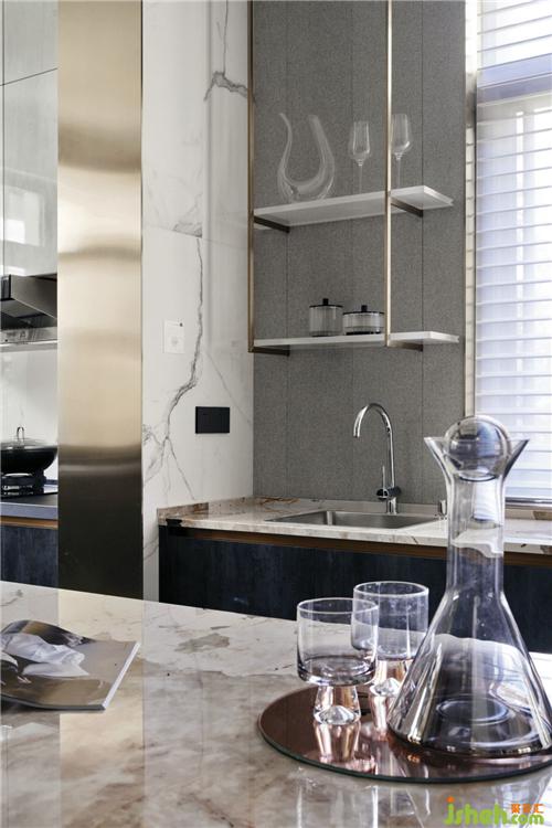 在餐廳與廚房交界處設(shè)計(jì)西廚區(qū)域,島臺(tái)臺(tái)面使用銀狐巖板,蒸烤箱、水吧臺(tái)設(shè)計(jì)在島臺(tái)兩側(cè),考慮到餐廳需要收納儲(chǔ)物,島臺(tái)加入收納功能;