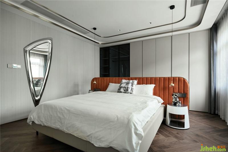 女兒房主色調(diào)為橘色,墻面上使用凹凸感很強(qiáng)的墻紙,搭配上cattelan italia的不規(guī)則鏡子;床背景設(shè)計(jì)現(xiàn)場(chǎng)制作的弧形與軟包搭配,考慮到原始戶型結(jié)構(gòu)為長(zhǎng)方形,則把化妝臺(tái)設(shè)置到床背景后,呈現(xiàn)出整個(gè)女兒房簡(jiǎn)單而奢華的情調(diào)。