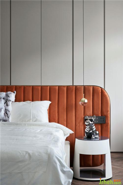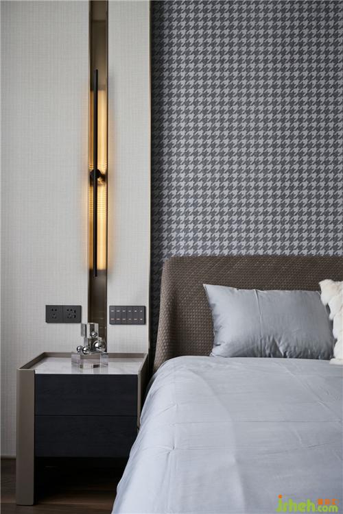 次臥硬裝與軟裝之間的配合十分緊密,墻面打造凹凸質(zhì)感,兩種材質(zhì)貼于墻上,同時(shí)床體尺寸配合墻面尺寸,兩側(cè)加入金屬線條掛壁燈,營(yíng)造整體溫馨氛圍;