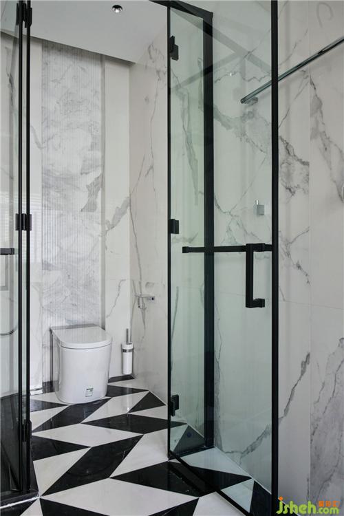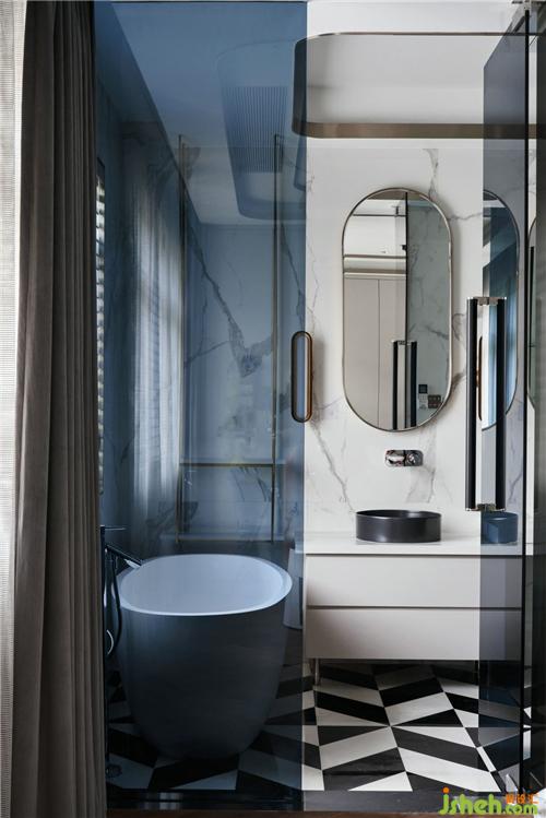 女兒房衛(wèi)生間使用黑白拼接地磚與白色紋理墻磚搭配,通過黑與白的相互交錯(cuò),杭州別墅裝飾可以打造出一種無限延伸的空間感;