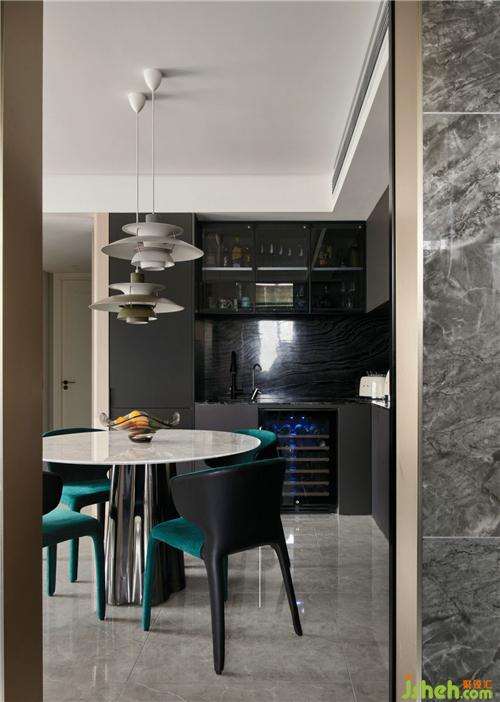 餐廳與客廳處于同一空間,兩者之前的聯(lián)系密不可分,沙發(fā)背景使用了白色大理石,則餐廳制作純黑的櫥柜。杭州裝修設(shè)計(jì)麻雀雖小五臟俱全,根據(jù)業(yè)主需求,紅酒柜、水吧臺(tái)、展示柜等都保留好位置。