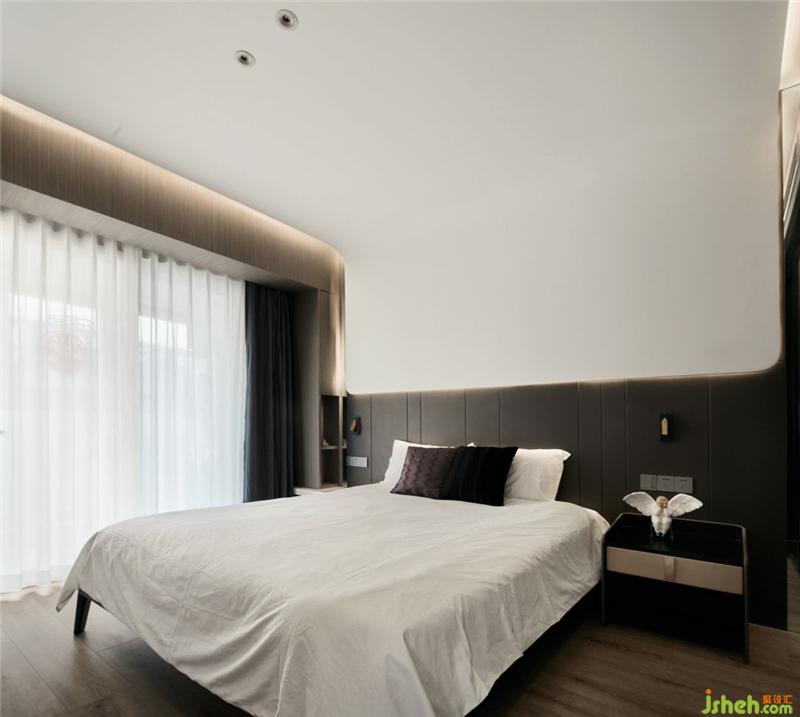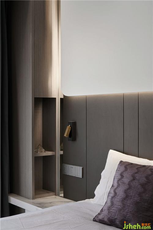 主臥吊頂拋開(kāi)了常規(guī)做法,做了一個(gè)異形延伸到墻面,成為了整個(gè)屋子的亮點(diǎn)。設(shè)計(jì)師根據(jù)原始戶型為主臥留出一個(gè)衣帽間的位置,衣帽間墻體另一側(cè)作為走廊上的儲(chǔ)物空間,物盡其用便是如此吧。