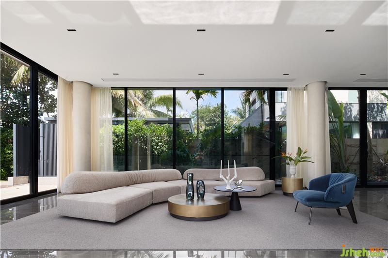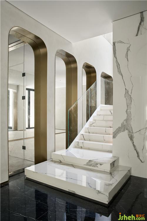 與以往的封閉式玄關(guān)不同,設(shè)計師利用鏡面金屬與鏤空設(shè)計,結(jié)合超高挑空,打造出一個光與影錯綜復(fù)雜的空間。設(shè)計圓弧型吊頂搭配星光式的吊燈,當(dāng)早晨陽光照進玄關(guān),甚至一番美景。