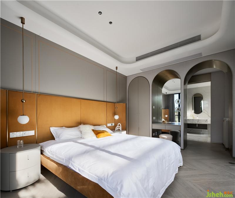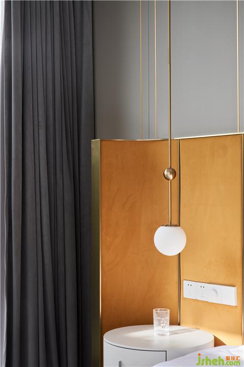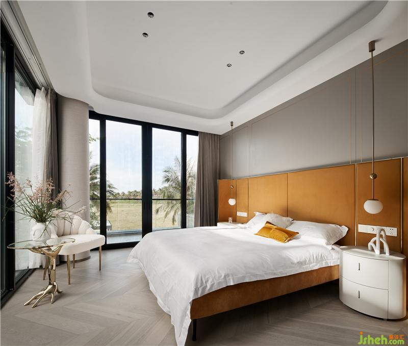 次臥主要打造一個相對活力的臥室,所以使用鮮艷的橙色作為主色調,現場制作的硬包與床架選用同一布藝材質,金屬作為點綴;單人沙發(fā)散發(fā)著優(yōu)雅華貴的氣息,邊幾非常有特色,是兩只手掌組合的形狀。
