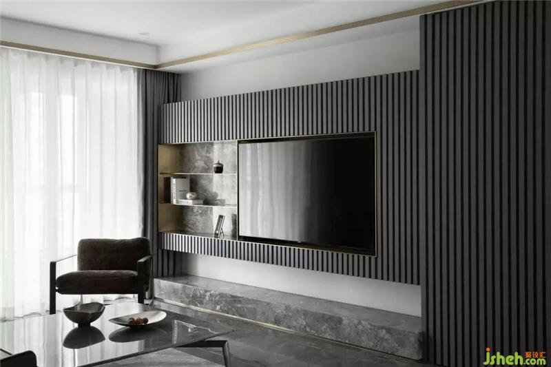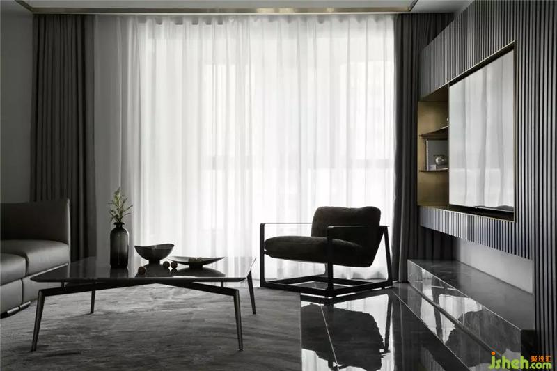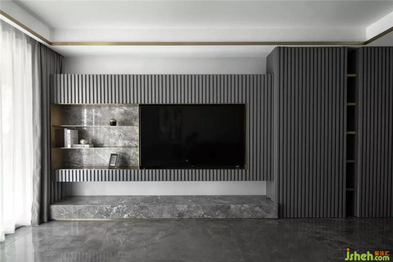 全空間以灰白色調(diào)為主,電視墻隱形柜門的格柵線條,滿足功能同時(shí)豐富了空間的層次感;沙發(fā)背后灰紋路的大理石裝飾和金屬板的運(yùn)用,杭州裝修設(shè)計(jì)營(yíng)造出一種有機(jī)的現(xiàn)代奢華感,用線條勾勒出一個(gè)干凈簡(jiǎn)單的畫(huà)面。