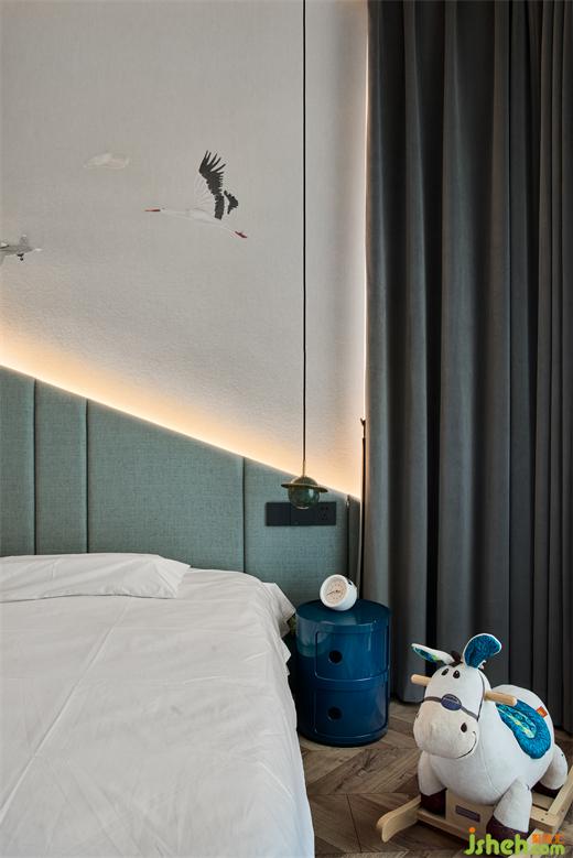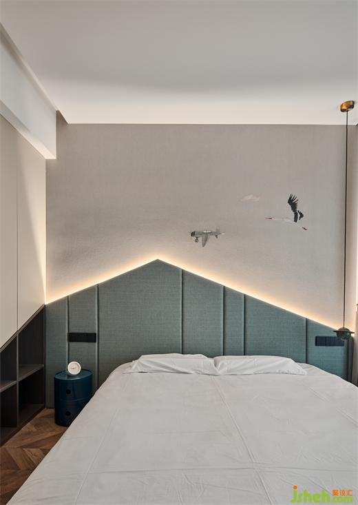 兒童房的設(shè)計(jì)充滿了童趣,床的硬包不似以往的長方形,而采用了不規(guī)則的硬包,讓童趣撲面而來。房間采用無主燈的設(shè)計(jì),讓燈隱藏在硬包的邊沿,靈動(dòng)活潑。