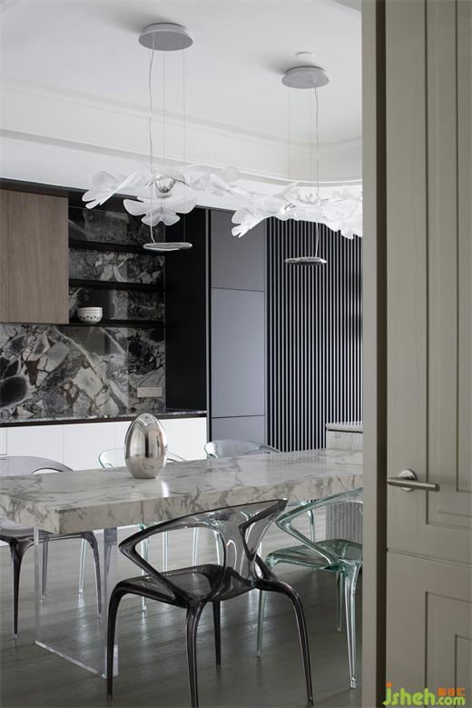 上海豪宅設計改變傳統(tǒng)餐桌形式,島臺與餐桌的結合,同時增加西廚區(qū)域,滿足餐廳多場景使用。