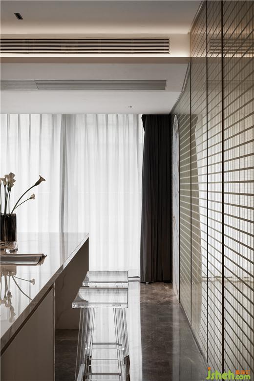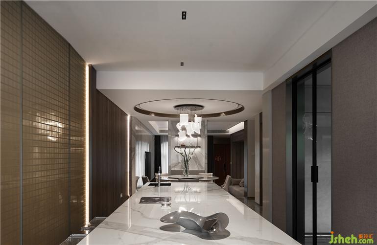 西餐島臺內(nèi)部內(nèi)嵌式的蒸箱、烤箱很大程度的釋放了空間。別墅設(shè)計(jì)視覺上的簡約流暢促進(jìn)著家人之間親切的交談,消除房屋格局帶來的距離感。