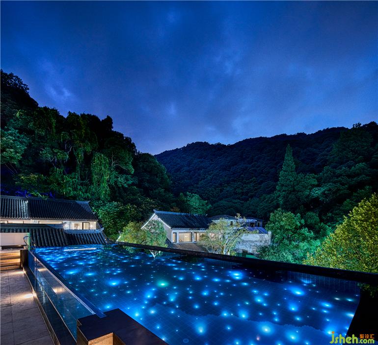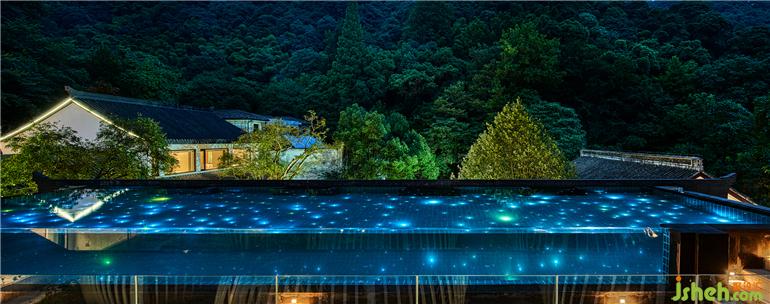 ▲入夜后亮起點點星光,杭州度假酒店設(shè)計讓泳池變得與星空一樣神秘