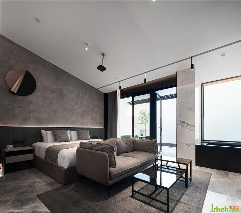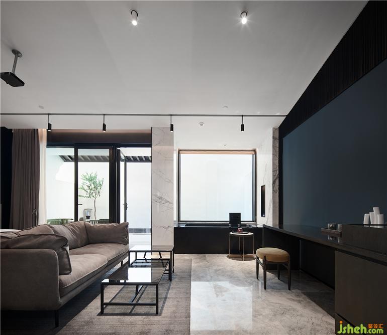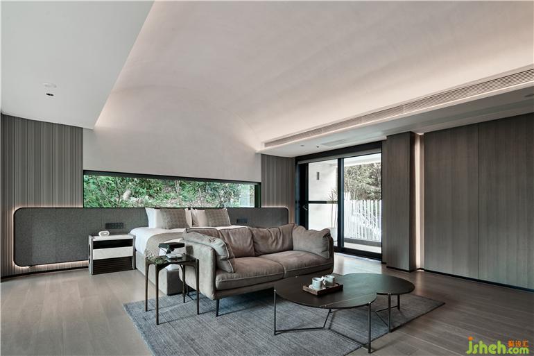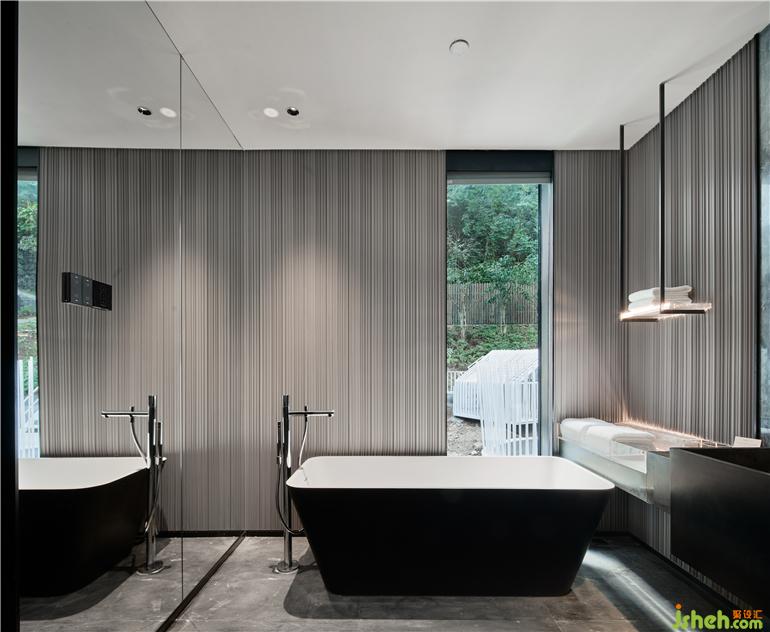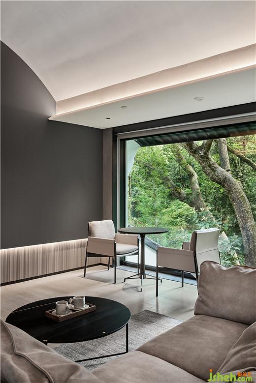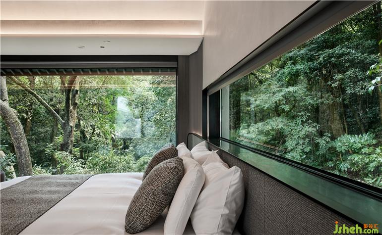 杭州度假酒店設(shè)計(jì)兩面通透的落地玻璃窗,把山林綠意帶來(lái)眼前。