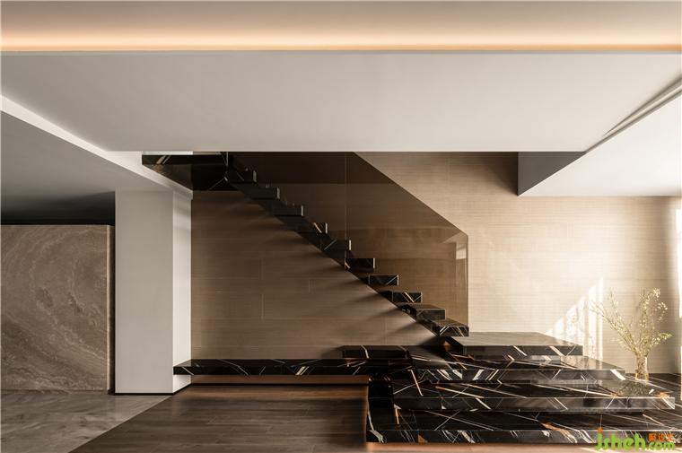 定制鋼架樓梯經(jīng)過反復(fù)驗(yàn)證確保其安全性;面對(duì)頂樓散落的陽光,勞倫黑金色石材帶來的質(zhì)感搭配歐茶色玻璃扶手,整座樓梯呈現(xiàn)出如藝術(shù)裝置一般的觀賞性。兼顧使用與美感。