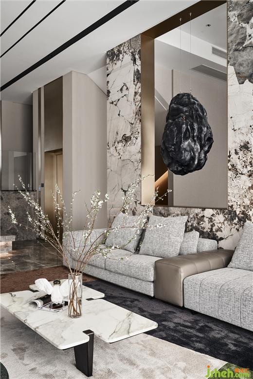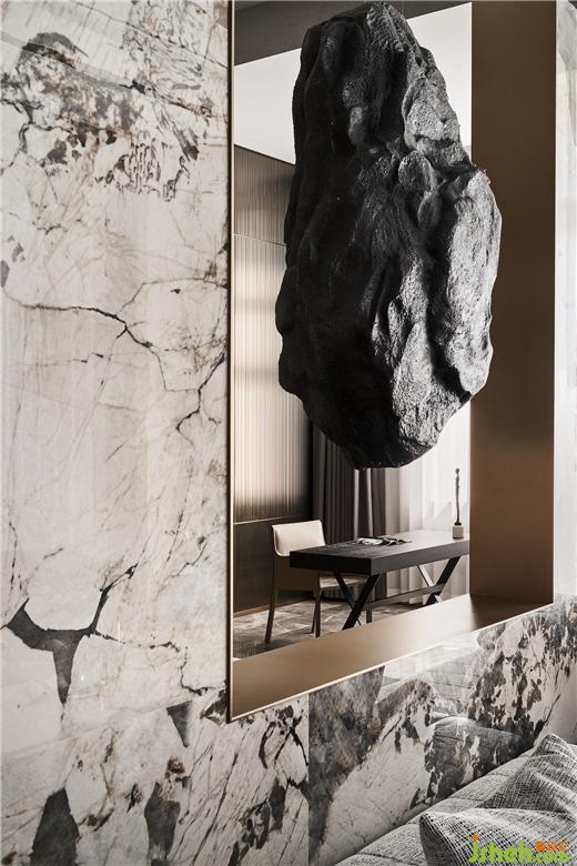 來(lái)自潘多拉的奢石色彩將共享、開(kāi)放的客廳與相對(duì)隱秘的工作區(qū)隔開(kāi),背景墻面的“開(kāi)窗”又使得空間彼此聯(lián)系。