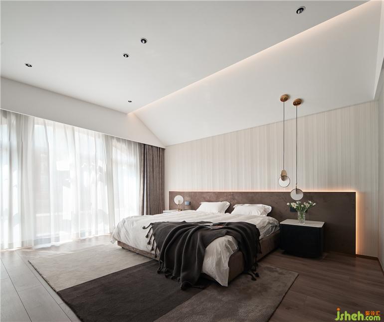 主臥自帶步入式衣帽間與休閑露臺,傾斜的頂面原始結(jié)構(gòu)采用疊級處理,經(jīng)典VESCOM壁紙獨(dú)有的長條肌理為為簡奢的空間營造立體感。