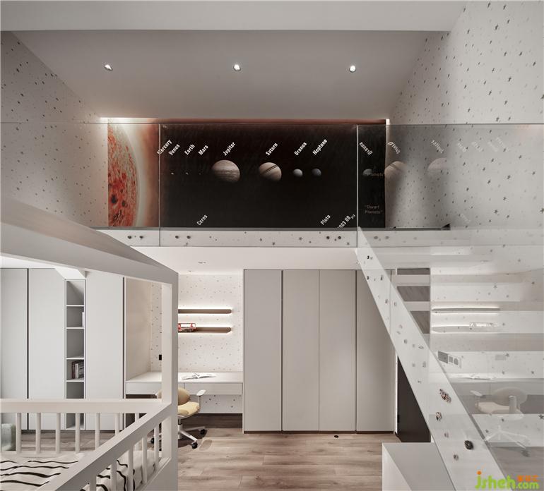 為兩個活潑可愛的孩子定制的互動空間,杭州綠野春天別墅裝飾設(shè)計利用建筑中的坡頂創(chuàng)造出類似閣樓的復(fù)式結(jié)構(gòu),供孩子們自由的躲藏、攀爬、玩耍,伴隨他們一路學(xué)習(xí)成長,度過幸福的童年生活。