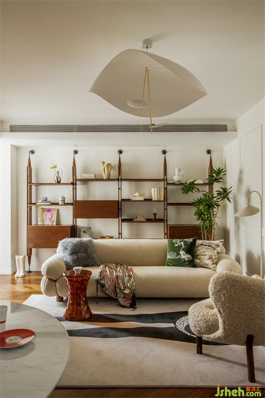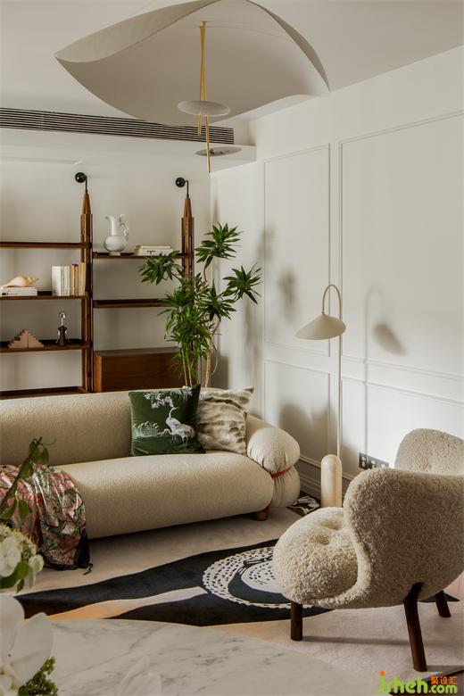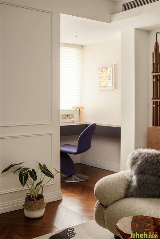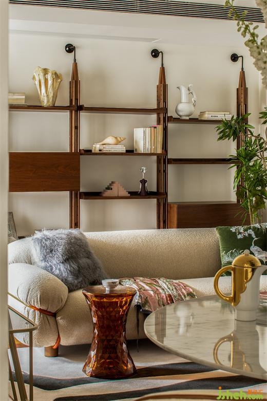 與傳統(tǒng)布局不同,這里沒有所謂電視墻、沙發(fā)墻的概念,空間的每一處都是服務(wù)與居住者的生活狀態(tài)??蛷d中采光最好的地方留給了讀書角:捧一杯茶、一本書,點(diǎn)一盞香薰,都是療愈人心的好物。上海公寓改造設(shè)計(jì)用地毯圍合出客廳的空間,Tacchini的主沙發(fā)大膽的體積和優(yōu)雅精致的設(shè)計(jì)占據(jù)空間C位,橙色的金屬框架是刻意為之,也是設(shè)計(jì)師想表達(dá)的法式浪漫——在平凡中總藏著一些小驚喜。