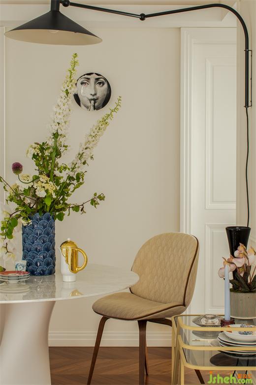 一盞由大師柯布西耶設(shè)計(jì)的馬賽壁燈圍合出餐廳空間,自由變換的形態(tài),給餐廳提供了不同的就餐氛圍。MDF的S圓形餐桌不言而喻,S形的桌腿,外柔內(nèi)剛,極具美學(xué)沖擊感。