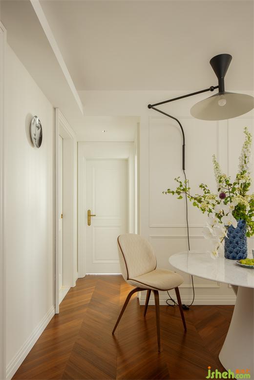 因?yàn)樵冀Y(jié)構(gòu)的局限,硬裝上沒(méi)有做過(guò)多裝飾,墻面簡(jiǎn)單的定制線條營(yíng)造著輕松的法式氣息。定制門(mén)與門(mén)套在傳統(tǒng)法式線條疊加的基礎(chǔ)上,上海公寓改造設(shè)計(jì)摒棄了過(guò)多的弧形元素,采用直線條疊加,既符合空間柔美中又帶有硬朗的氣質(zhì),同時(shí)也表達(dá)了居住者的性格與處世態(tài)度。