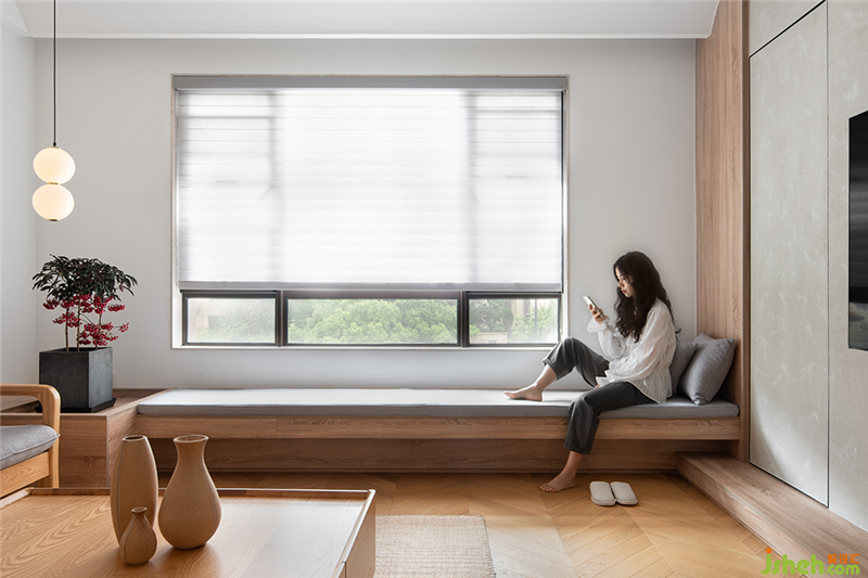 在愜意的午后,朝南窗戶光線延綿,女主人在窗榻下沐浴陽(yáng)光的同時(shí)也體驗(yàn)到了自由與舒適。