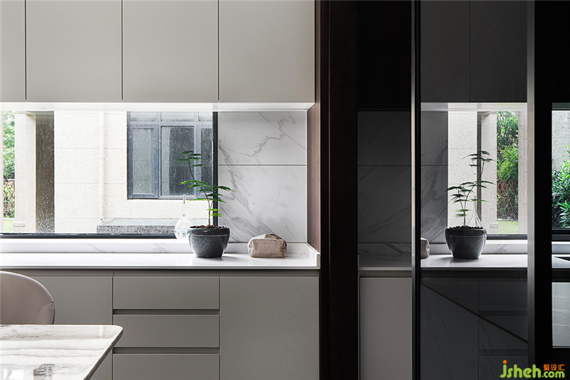 為了給廚房提供一定程度的隱私,又能與公共空間不失聯(lián)系,故在中島設置“L”型玻璃隔斷,以幫助隱藏那些有時不可避免的混亂和雜亂。