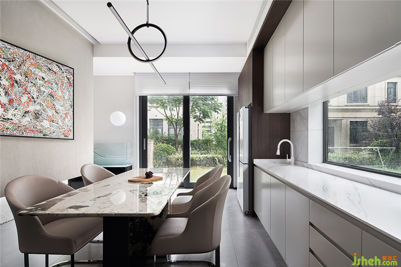 在我們看來,硬裝的沉靜并不會限制帶有色彩的裝飾,繪畫和大理石餐臺使室內煥然一新,仿佛充滿了新鮮的空氣。