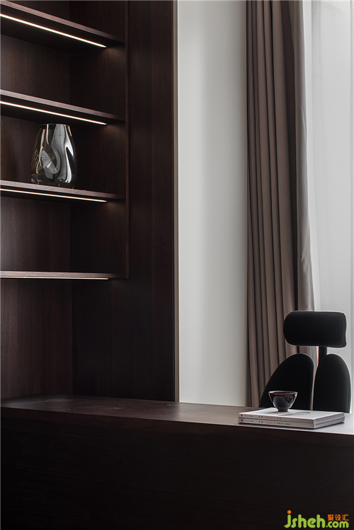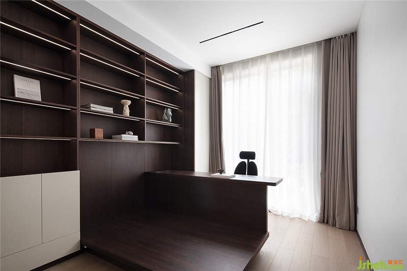 推開進戶一側的暗門,則是一層書房,沉浸式單色相能使復雜的輪廓安靜下來,舟山別墅裝令閱讀者仿佛置身在一個沒有聲響的世界里。