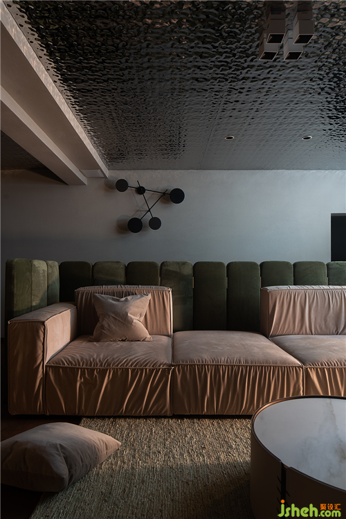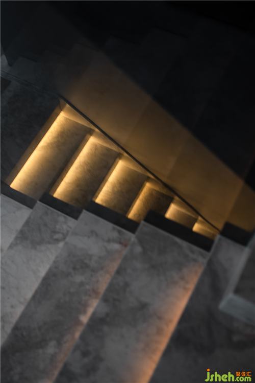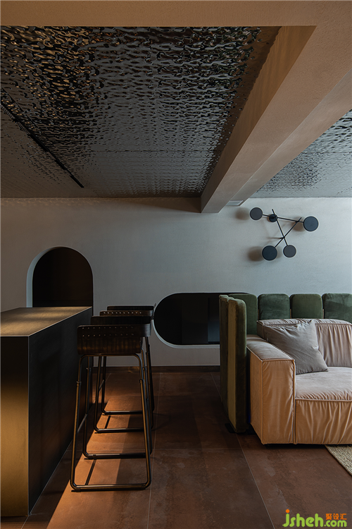 拾級(jí)而下的地下空間,由于層高的限制,空間頂面采用波紋鏡面質(zhì)感,解決了空間壓抑的缺點(diǎn),模糊了空間的界限。