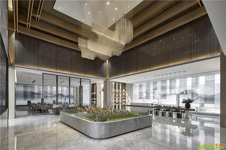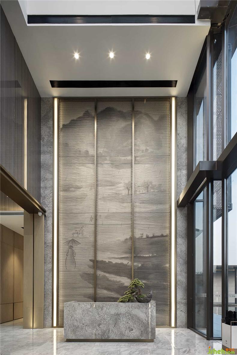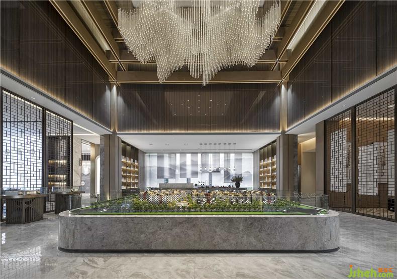 沙盤區(qū)頂部的玻璃紋理使得空間變得飽滿而不壓抑,宛如屋檐,又似“天井”,更像高山中縹緲輕盈的白云,置身天地,當?shù)谩耙挥[眾山小?!庇窒窬d延宛轉(zhuǎn)的江海河流,為所經(jīng)所至之地帶去貫恒千年萬年的福澤。房屋瓦舍,從古至今是人類“家”文明的重要承載物。在這樣的氣勢下,居住者的心境與環(huán)境相影響,也都會變得寬闊宏偉。