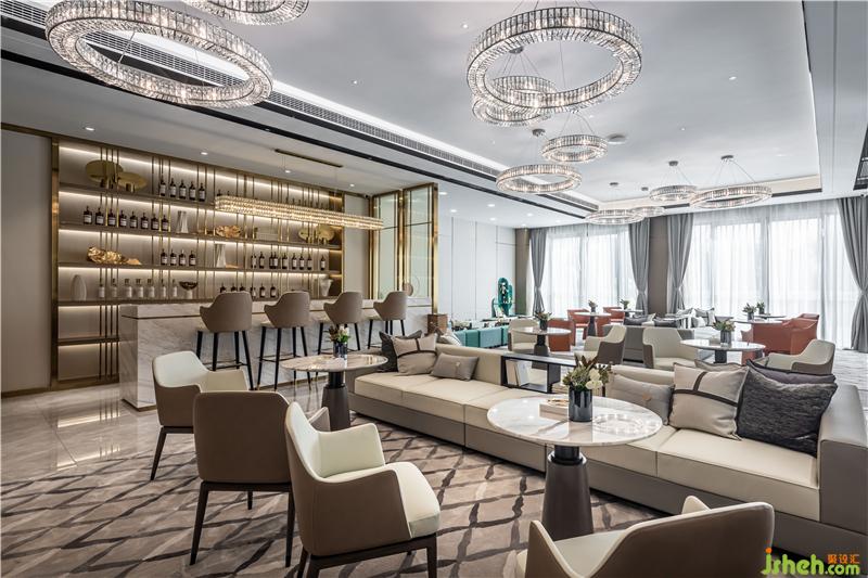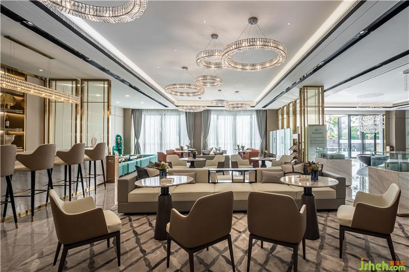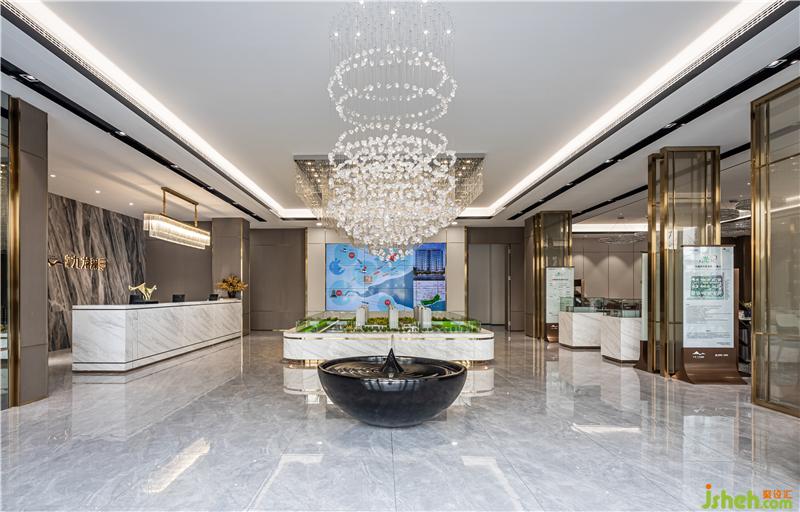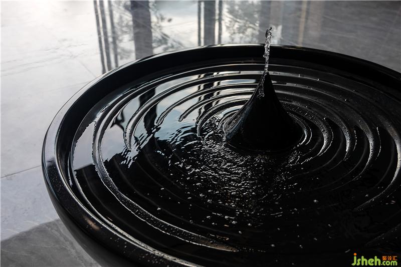 進(jìn)入前廳,首先映入眼簾的便是乍浦的“水”,水滴形狀的不規(guī)則吊燈,跳躍的水珠緩解了縱向線條的單一和緊張,為空間增添了靈動感,與流水裝置的雕塑相互呼應(yīng)——水滴落在水面上,蕩起層層漣漪。