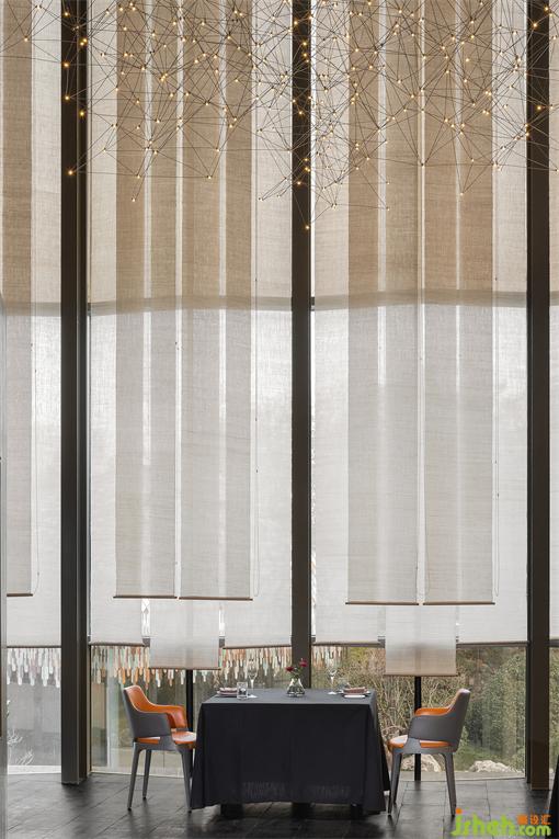 經(jīng)過一段小橋流水進(jìn)入餐廳,作為從車水馬龍的鬧市向城市秘境的過渡,儀式感由此代入。這是一座三層挑高建筑,北京餐廳設(shè)計(jì)師以超大面積的玻璃幕墻隔開內(nèi)與外,屏蔽喧囂而沒有隔絕自然,天光以更溫柔的姿態(tài)映照室內(nèi)。戶外露臺(tái)是項(xiàng)目設(shè)計(jì)的亮點(diǎn)之一,在如此鮮有的地理位置上造一處安靜的“小園”,是魯采同比周邊環(huán)境的特色所在,客人悠然靜坐,盡顯情趣。