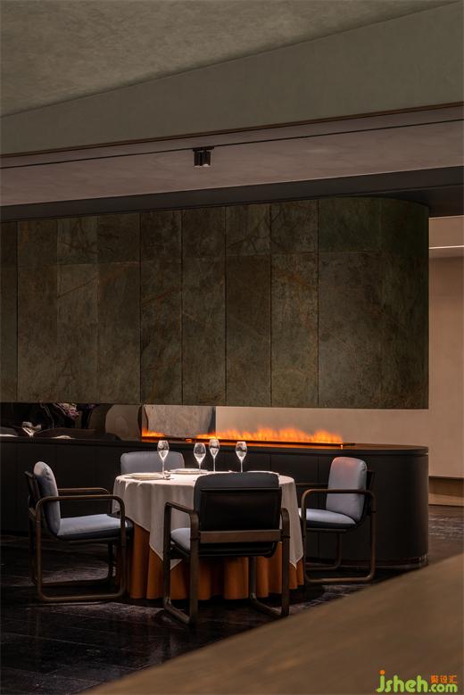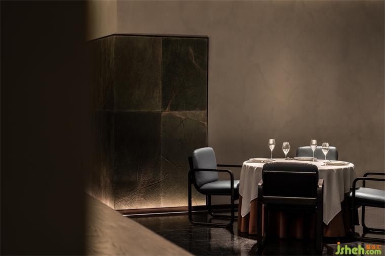 桌椅、地面采用的灰藍(lán)色系的顏色搭配,使得整個空間內(nèi)散發(fā)出一種典雅流暢的氣息。柔和的燈光灑向整個空間,給予圍坐而談的人們充分的私密感與安全感。