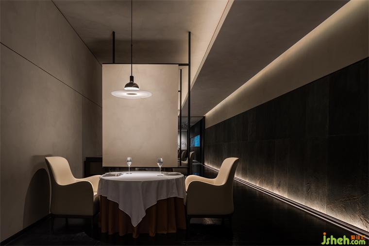 屋頂局部點(diǎn)綴的燈光,在照亮空間的框架結(jié)構(gòu)的基礎(chǔ)上,照亮餐桌本身,營造出良好的就餐氛圍,也將空間主角還給餐桌上的美食,如同茉莉花語,本真誠摯。