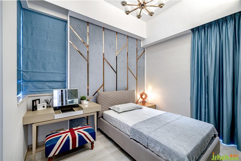 二樓的兩個(gè)房間用上截然不同的色調(diào),姐姐的房間采用型格的灰藍(lán)色作主調(diào),床頭有樹形金屬花線,配搭簡單的裝潢,成熟有品味?,F(xiàn)代別墅裝飾