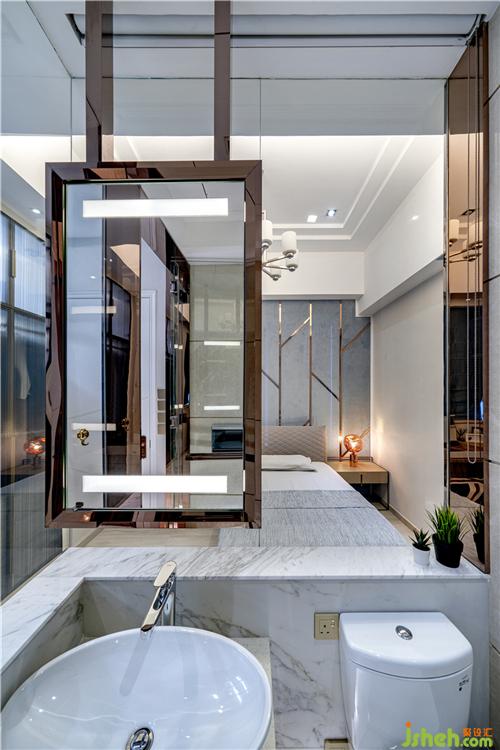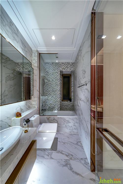 妹妹的房間則以粉紅色和白色為主題色,衣柜和床背的墻身有幾何線條連接,可愛之余增加設(shè)計(jì)感。兩個(gè)房間均用大量云石元素打造套廁。