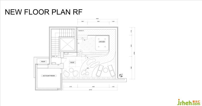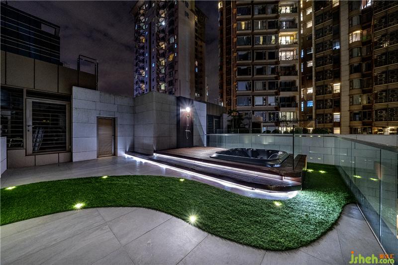 于主人房外的樓梯拾級而上到達天臺,設(shè)計師為維持整個家的一體感,天臺用色和花園十分相似,一樣以石地板配搭綠草和木地臺。不同的是,為響應(yīng)天臺按摩浴池的主題,設(shè)計師將草地鋪蓋成流線形,悠閑有特色。